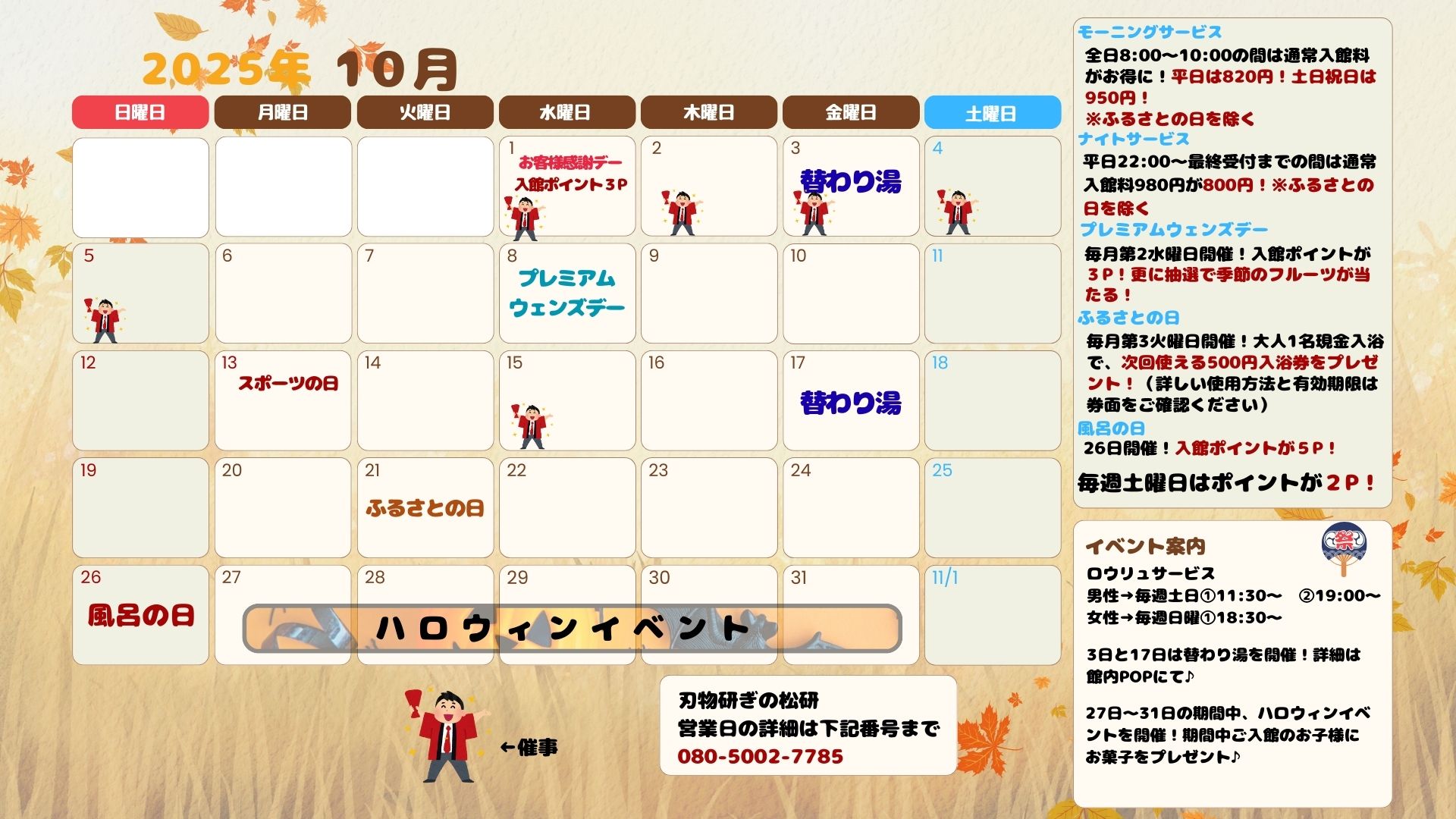 風呂の日、ふるさとの日など、毎月お得なイベントを実施しております。